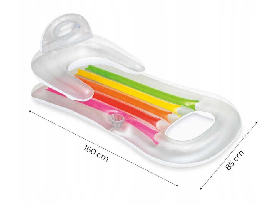 Fotel jest idealny na basen, pobyt nad jeziorem lub morzem. Nadmuchiwany fotel ma 160 centymetrów długości i 85 centymetrów szerokości, wyposażony jest w wygodne oparcie/zagłówek oraz otwór, do którego można włożyć butelkę lub szklankę z napojem.