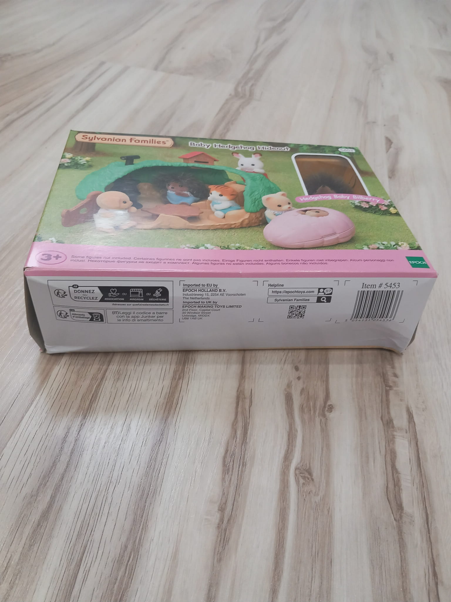 W zestawie ,,Domek jeżyka" Sylvanian Families znajduje się domek o wielkości ok. 14 cm ze zjeżdżalnią i skrzynką na listy, piec, stół, śpiwór i figurka małego jeża.