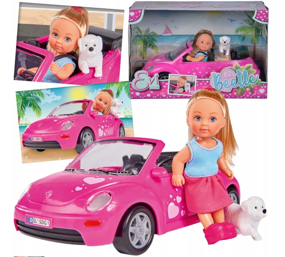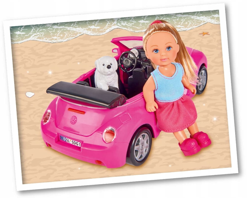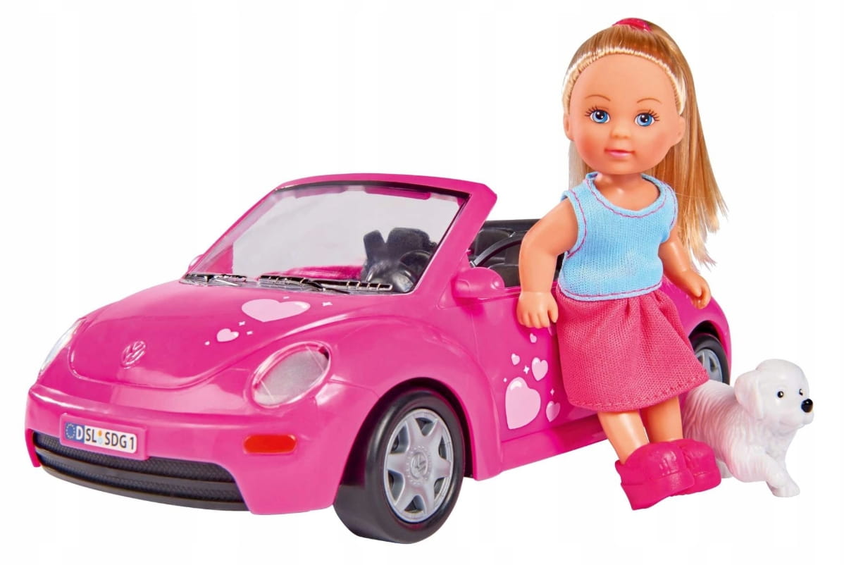 Laleczkę można wsadzić do pojazdu i zapiąć w pasy. Evi uda się na przejażdżkę wraz z pieskiem siedzącym na tylnych siedzeniach.