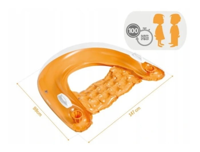 Fotel materac w jednym do pływania posiada dwa uchwyty do trzymania, oraz dwa miejsca na przechowywanie picia w butelkach.