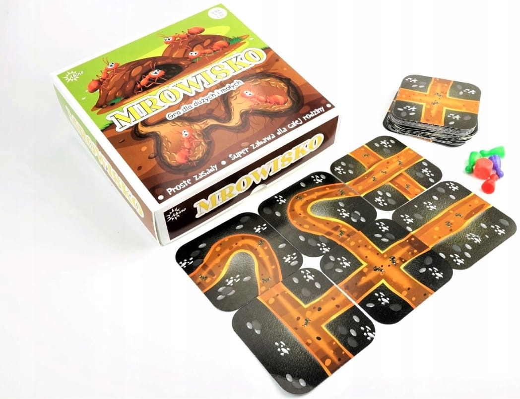 Zawartość: 44 karty z tunelami, karta wyjścia z mrowiska, 4 pionki i kostka.