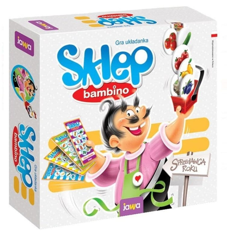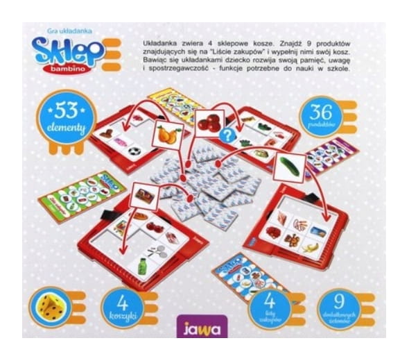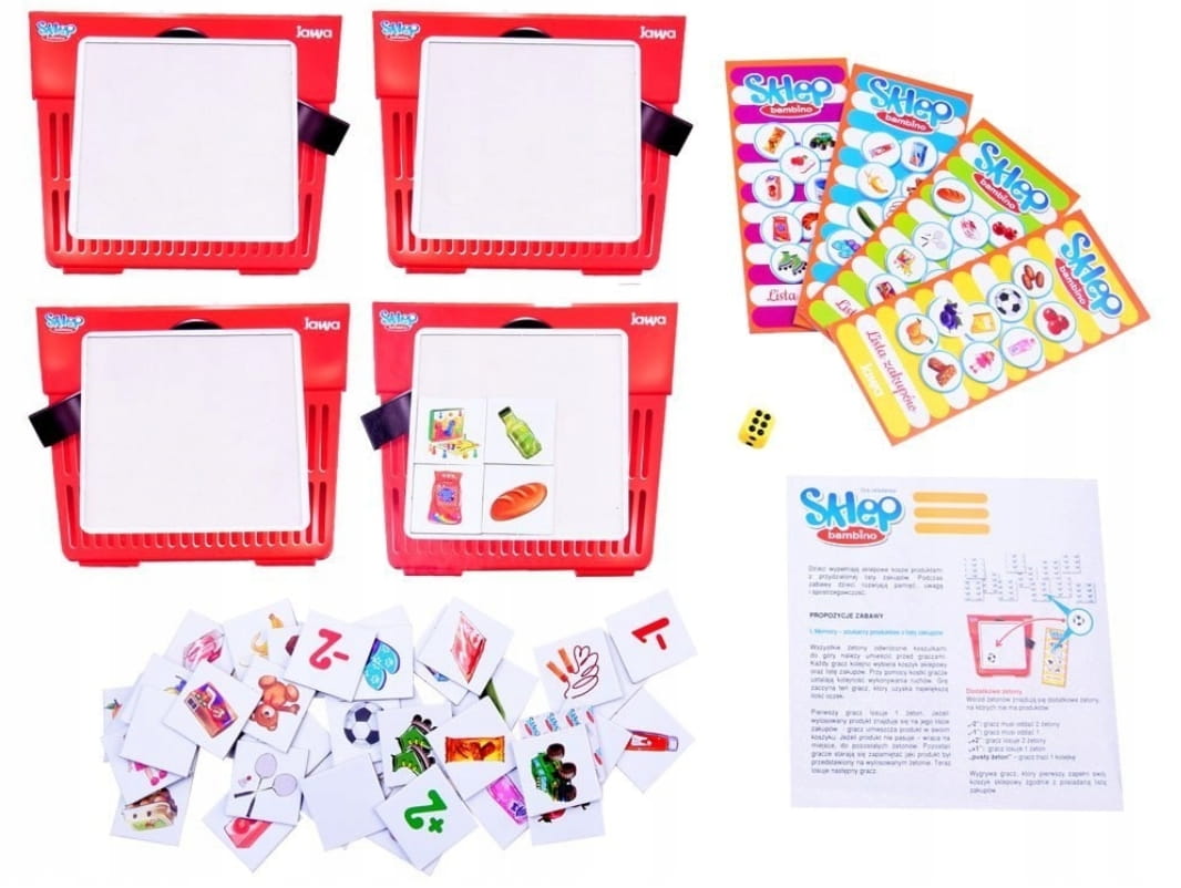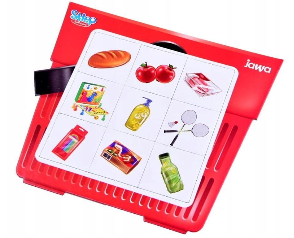 Zadaniem dzieci jest znalezienie dziewięciu produktów z "Listy zakupów" i umieszczenie ich w posiadanym koszyku.