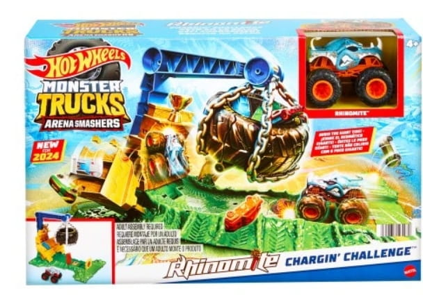 Przejedź dołączonym pojazdem Hot Wheels Monster Trucks Rhinomite w skali 1:64 przez serię przeszkód i sięgnij po zwycięstwo, odsłaniając trofeum w zestawie Wyzwanie Rhinomite.