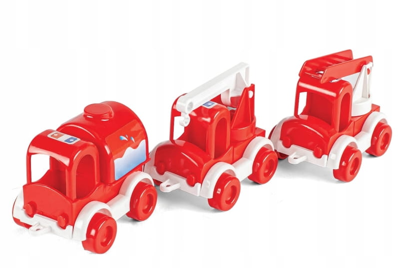 W zestawie ze strażą pożarną, znajdziemy kolorowy zestaw 3 autek: wóz strażacki z drabiną, autko z dźwigiem i cysternę. Połączone elementy powodują, że można bawić się nimi razem lub rozczepiać i używać pojedynczo. Zestaw pojazdów straży pożarnej, dzięki kilku elementom to również świetna okazja by zaprosić do zabawy kogoś z rodziny lub swoich rówieśników – wspólne spędzanie czasu wzmocni kompetencje społeczne dziecka, nauczy dzielenia się oraz współpracy.