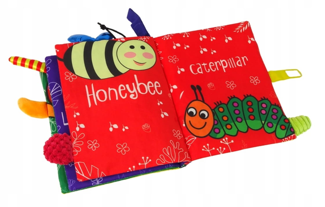 Książeczka Miękka Owady Kolorowa To zachwycająca książeczka z materiału dla dzieci, stworzona w celu wprowadzenia najmłodszych czytelników w fascynujący świat różnorodnych zwierzątek.