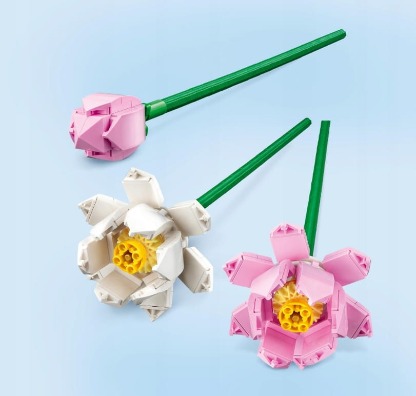 Ten wyjątkowy zestaw pozwala zbudować dwa lotosy w pełnym rozkwicie oraz jeden pączek w delikatnych odcieniach różu i bieli, a także długie zielone łodygi.