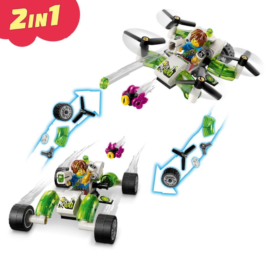 Zbuduj terenówkę Mateo z LEGO® DREAMZzz™ w formie pojazdu terenowego lub helikoptera. W trybie samochodu staje się niezawodną terenówką, a w trybie helikoptera — potężną maszyną latającą z silnikami z tyłu. Pościg za klepsydrą trwa!