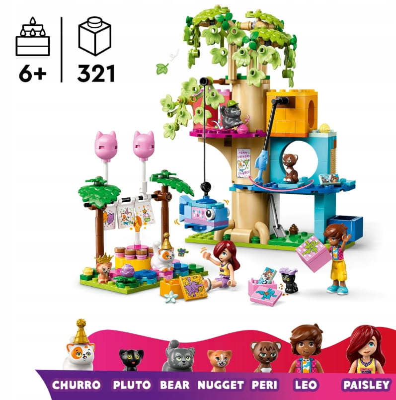 Zestaw pozwala odegrać scenki z urodzinowego przyjęcia Churro, który zaprosił czterech kocich przyjaciół oraz bohaterów LEGO Friends, Leo i Paisley. Odkryj fajne szczegóły, w tym prezenty urodzinowe, banery i balony w kształcie kotów. Dzieci będą zachwycone zabawą w domku na drzewie dla kotów, w którym znajduje się piniata w kształcie ryby, zabawka dla kota, trawa, fontanna z wodą i kuweta. Następnie koty siadają przy obrotowym stole, aby delektować się urodzinowym tortem Churro. Dzięki tak wielu elementom dzieci mogą za każdym razem opowiedzieć inną historię o przyjaźni.