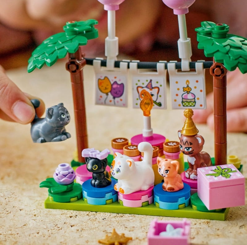- Zestaw konstrukcyjny dla małych miłośników kotów — ten zestaw LEGO® Friends Kocie przyjęcie urodzinowe i domek na drzewie dla dziewczynek i chłopców w wieku od sześciu lat zawiera dwie minilaleczki i pięć figurek kotów, co pozwala na twórczą zabawę