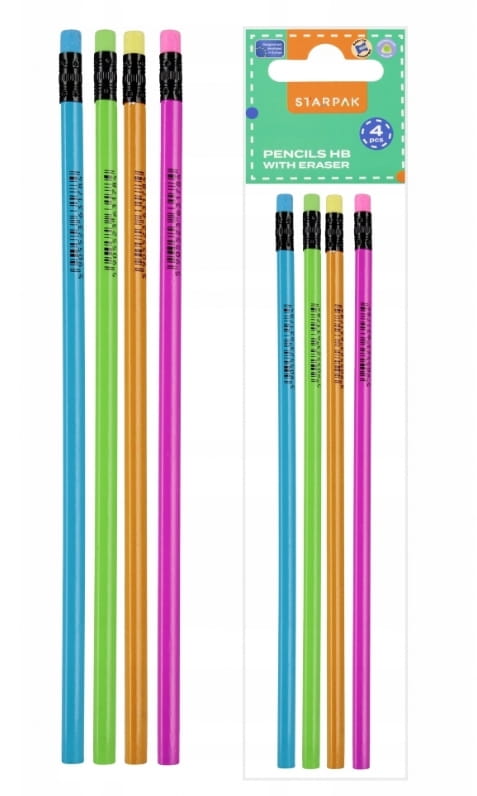 Zestaw 4 ołówków z gumką z kolekcji STARPAK w intensywnych kolorach. Każdy ołówek zdobiony kolorową grafiką.