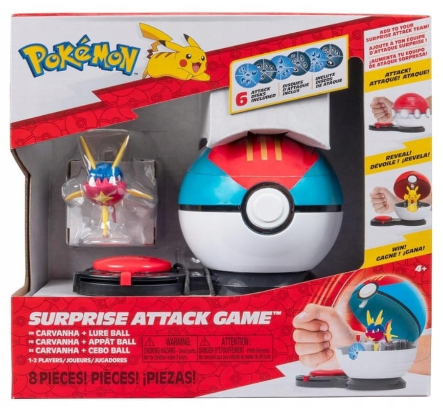 Wystarczy, że wybierzesz Pokémona, z którym chcesz walczyć i dysk atakujący, włożysz je do Pokéballa Surprise Attack i wciśniesz przycisk, aby wprawić Pokéballa w ruch obrotowy i odsłonić swojego Pokémon oraz jego atak!