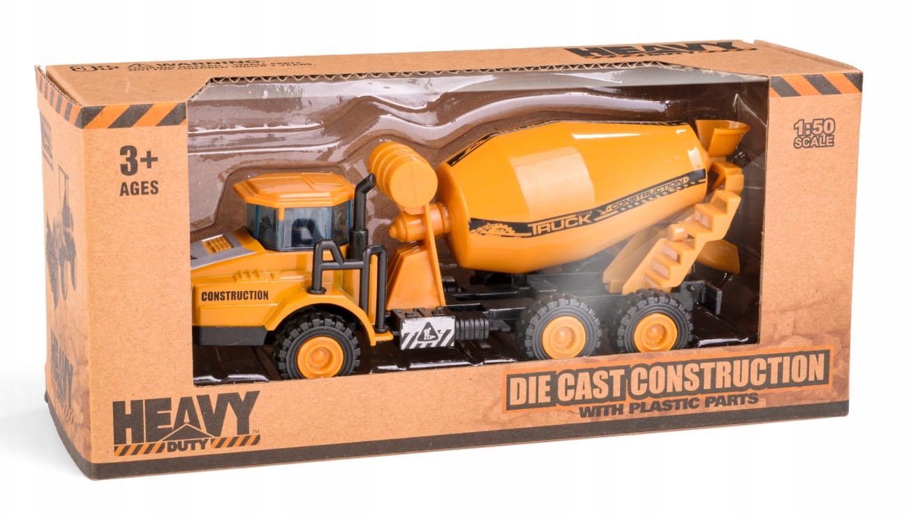 - Skala 1:50 – Precyzyjnie odwzorowany model betoniarki, idealny do zabawy oraz kolekcjonowania.