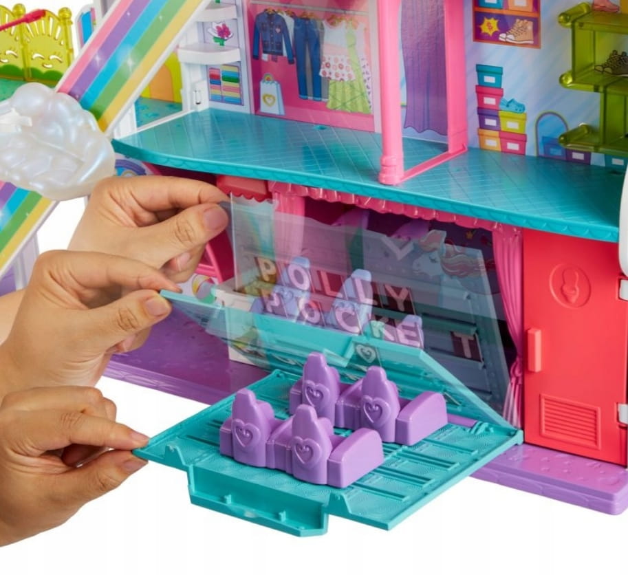 Tęczowe centrum handlowe Polly Pocket z akcesoriami i laleczką. Zestaw posiada mnóstwo obszarów zabawy. te z ubraniami czy butami).