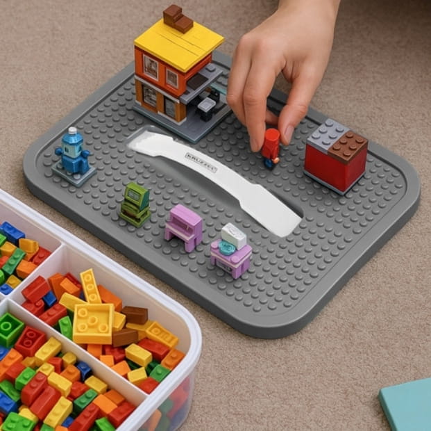 ✔️ pokrywa z uchwytem - posiada powierzchnię kompatybilną z klockami, dzięki czemu dziecko może budować bezpośrednio na pudełku, oszczędzasz miejsce i tworzysz mobilny plac zabaw – idealny na podróż lub do pokoju dziecięcego, dodatkowy uchwyt umożliwia wygodne przenoszenie zestawu