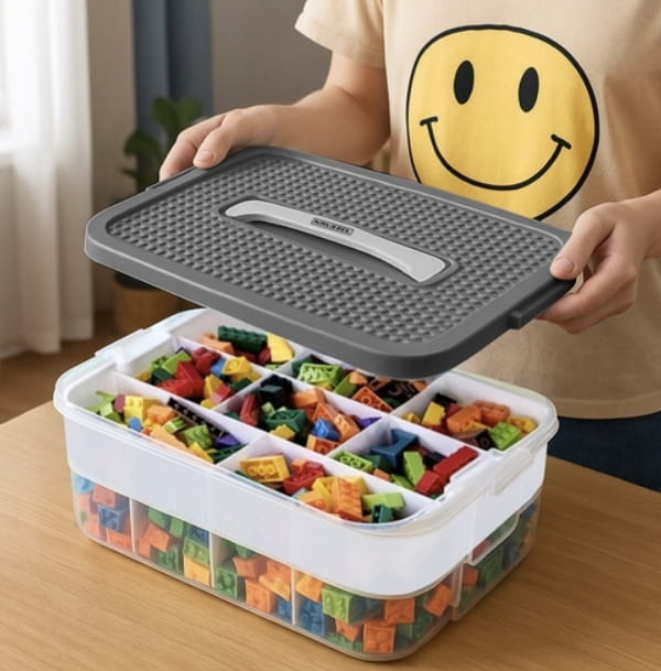 ✔️ piętra nie rozłączą się podczas przenoszenia – każdy poziom organizera posiada mocne zatrzaski, które trzymają wszystko na miejscu, nawet przy intensywnym użytkowaniu pudełko na klocki 15l zachowuje pełną stabilność – bez niekontrolowanego rozpadania się