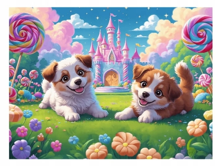 Po ułożeniu układanki powstanie obrazek o wymiarach 270x200 mm, przedstawiający dwa szczeniaczki w kolorowej krainie, na tle zamku.