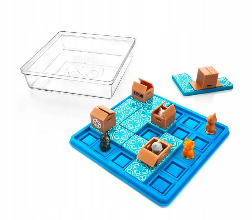 Rozłóż wszystkie elementy na planszy (koty oraz płytki z pudełkami). Następnie, przestawiaj płytki z pudełkami – jedna po drugiej – aż wszystkie koty znajdą się wewnątrz pudełek.
