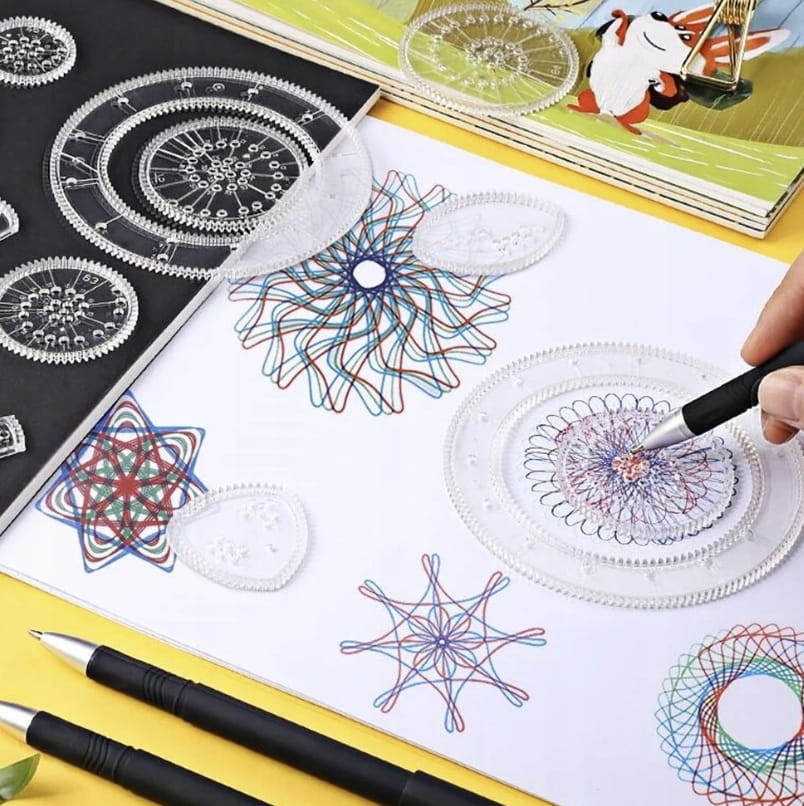 - ŁATWOŚĆ UŻYCIA CZYLI KREATYWNA ZABAWA I EDUKACJA - spirograf to zabawka geometryczna, która łączy naukę z rozrywką, pozwalając dzieciom (i dorosłym) na tworzenie pięknych i złożonych wzorów matematycznych. Przesuwając cienkopis po otworach koła, można tworzyć fascynujące wzory. Dzięki precyzyjnym krawędziom i zębatym wykończeniom, wzory rysowane przy użyciu zestawu Spirograf są harmonijne, a jednocześnie kreatywnie złożone. Zabawka pozwala rozwijać zdolności manualne, wyobraźnię oraz uczy zasad geometrii w sposób interaktywny i ciekawy.
