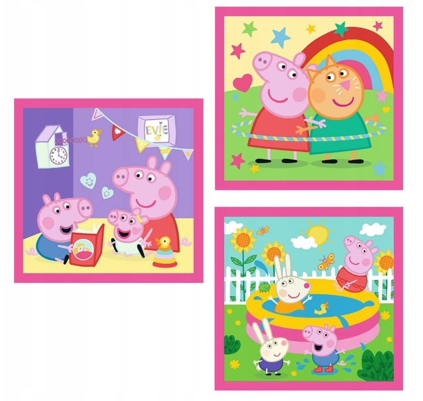 Peppa i przyjaciele to 3 niezależne układanki dla dzieci, zaprojektowane z myślą o małych fanach bajki Świnka Peppa.