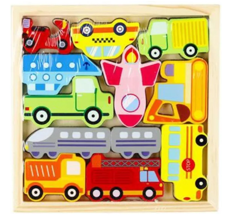Zabawa polega na dopasowaniu klocka do odpowiedniego kształtu, w tym przypadku są to pojazdy.