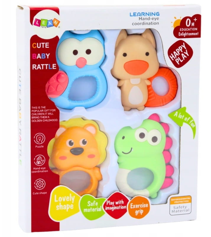 W skład zestawu wchodzi cztery grzechotki, z których każda ma unikalny kształt przypominający urocze zwierzątka, takie jak lew, wiewiórka czy sowa.